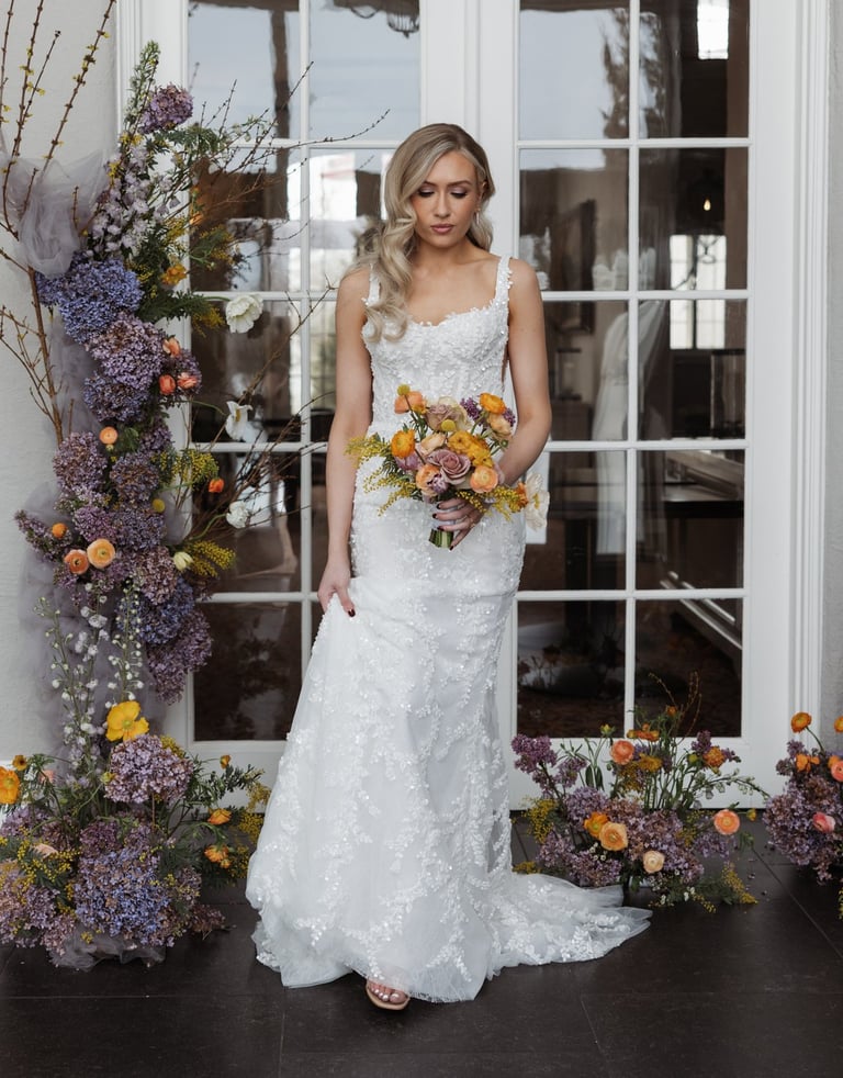 One of the highlights of this styled shoot is the meticulously arranged florals created by the team at Kmackenzie Designs. Drawing inspiration from the natural growth patterns of plants, Kelsey structured the florals to create the illusion of growth and movement. Delicate blooms intertwine with lush greenery, creating a sense of organic beauty that mirrors the splendor of a garden in full bloom.